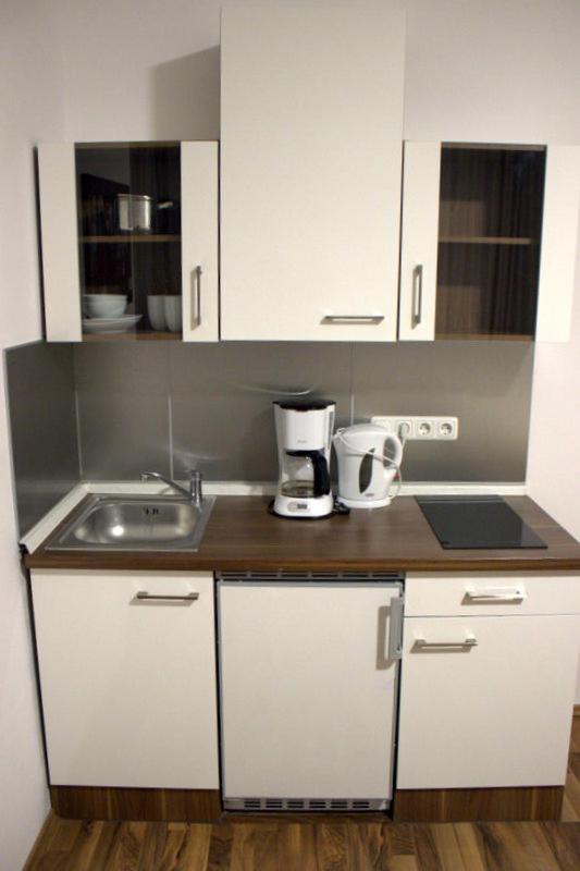 Die Studio-Apartments in der Porschepension sind klassisch eingerichtet. Die Unterkünfte verfügen über einen kombinierten Wohn-Schlafbereich mit einem Flachbild-Sat-TV, eine Küchenzeile sowie ein eigenes Bad.
